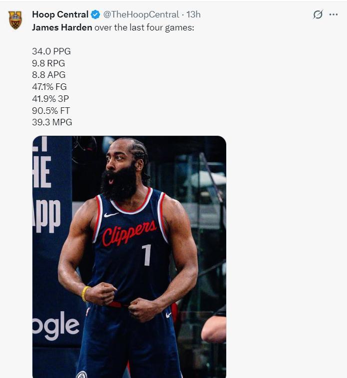 過去的四場比賽哈登場均39.3分鐘,拿到34分9.8籃板8.8助攻,命中率47.1%,三分命中率41.9%,罰球命中率90.5%,快船這不是吸血哈登是什麼?
