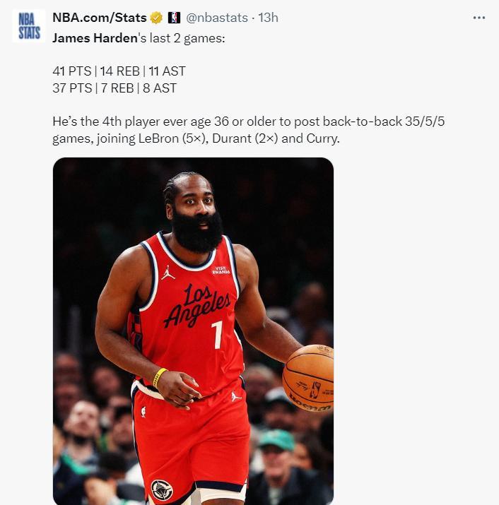 這場比賽哈登38分鐘,22中9,三分11中5,罰球15中14,拿到37分8助攻7籃板1搶斷,背靠背兩場比賽至少35+5+5,成爲聯盟第四位36歲以上背靠背至少兩戰35+5+5的球員,比肩詹姆斯、杜蘭特、庫裏。