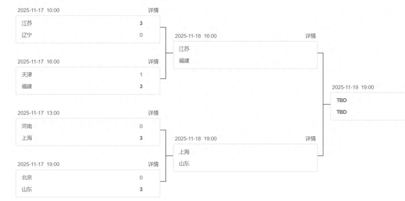 半決賽:江蘇VS福建、山東VS上海。北京、河南、天津、遼寧等隊會去打5-8排位賽。