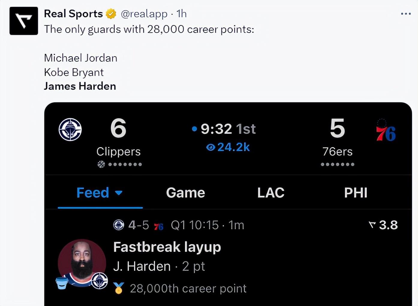 美媒寫道,NBA歷史上拿到28000分以上的得分後衛只有喬丹、科比、哈登三人。