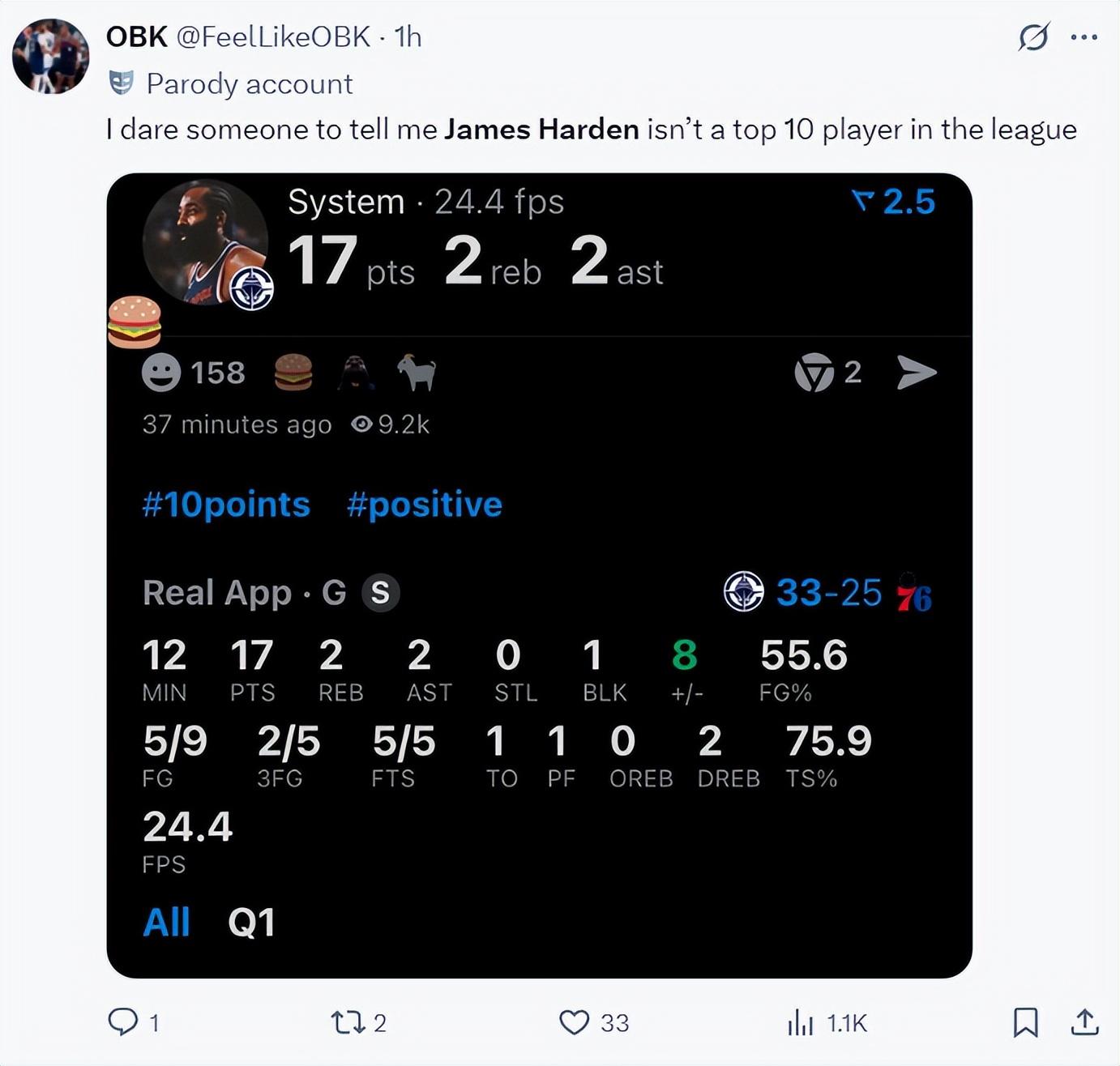 首節的哈登12分鐘,9中5,三分5中2,拿到17分2籃板2助攻1蓋帽,他延續了過去四場比賽的高光表現。