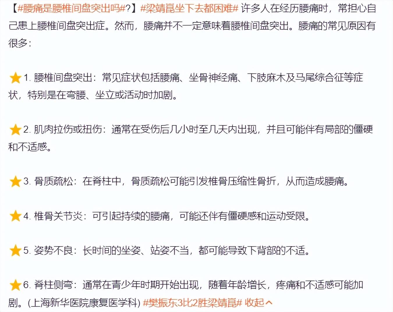 有醫生在社媒上爲球迷科普,腰椎間盤突出,常見的症狀爲腰痛、坐骨神經痛、下肢麻木以及馬尾綜合徵,特別是彎腰、坐立、活動時加劇疼痛。