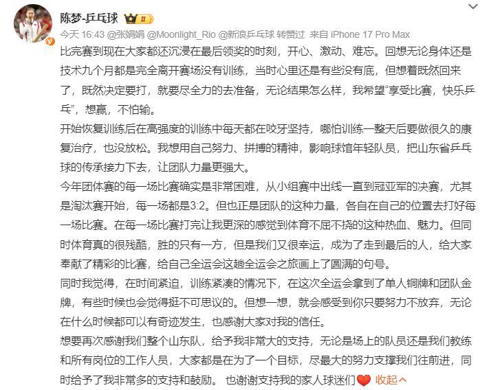陳夢在賽後也是大方的展示自己的團體賽金牌,陳夢也在個人社媒上告別了全運會,甚至是告別了乒乓球職業賽場。