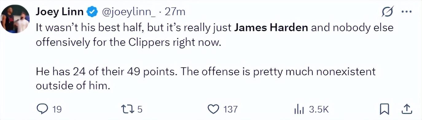 快船記者Joey Linn:這並不是哈登表現最好的上半場,但對於糟糕的快船來說是,進攻端全靠他一人,其他人根本無法提供半分幫助。