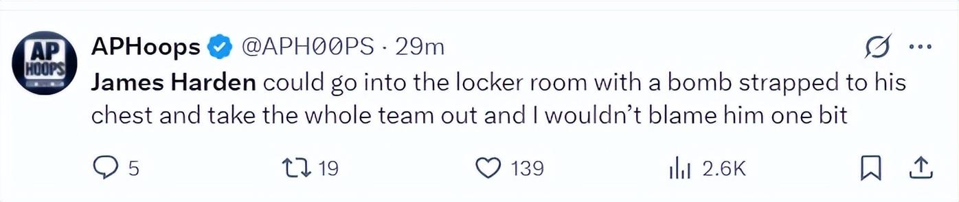 美媒APHoops:即使詹姆斯-哈登即便胸口綁着炸彈走進更衣室,然後炸掉全隊,我也不會因此責怪他半分。