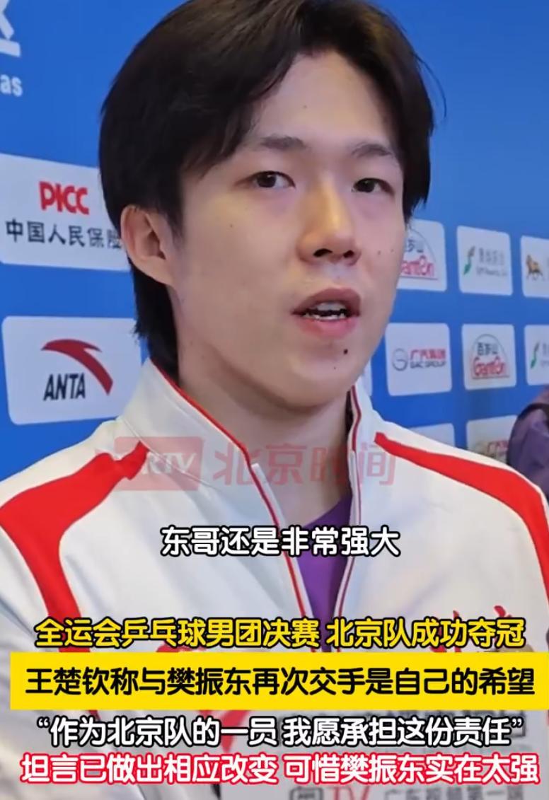 談到與樊振東的對決,王楚欽說道:實際上自己還是很想跟東哥交手,再去打一場,自己作爲北京隊的一員自己也希望去承擔這樣一份責任(單打時對陣樊振東)。其實這場自己已經有調整、有改變,但確實東哥還是非常強大。