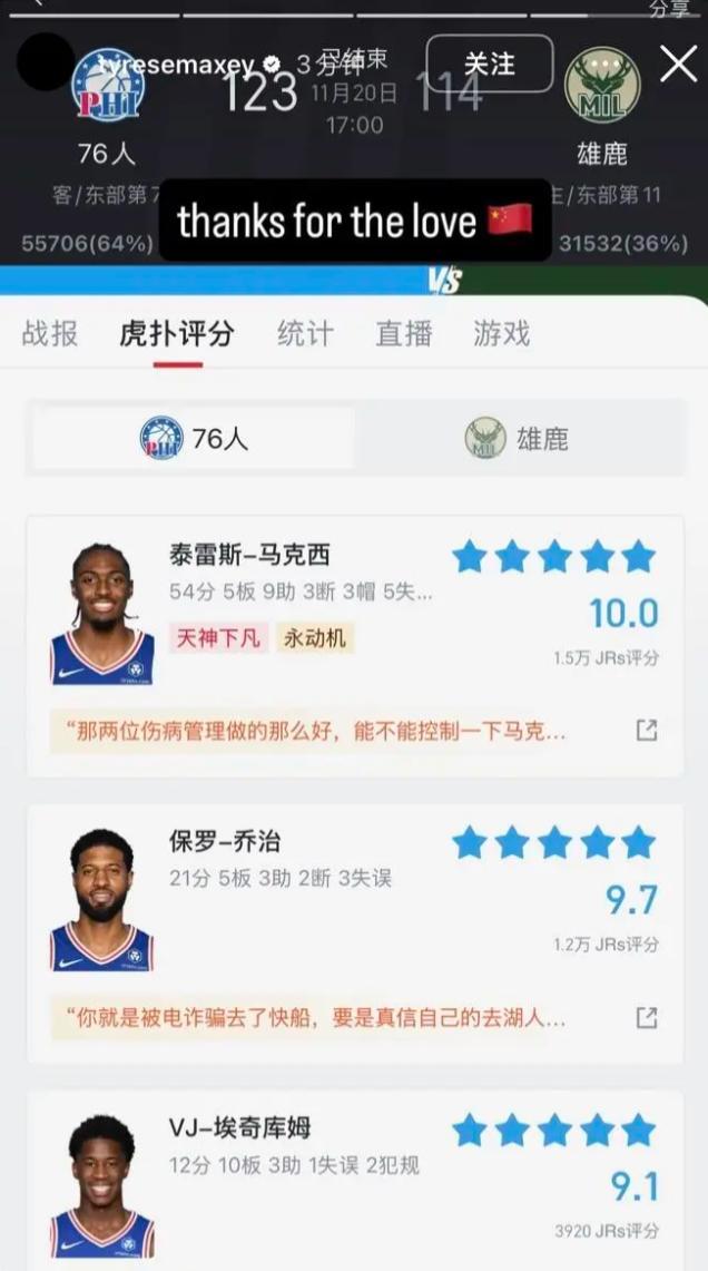 馬克西還在個人的IG上發佈了一張,中國球迷爲他打10分的截圖,他寫道:謝謝來自中國的愛。