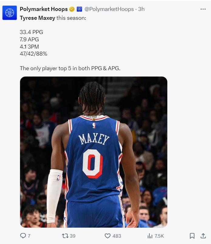馬克西本賽季場均33.4分7.9助攻4.7籃板4.1三分,命中率47%,三分命中率42%,聯盟唯一一個得分、助攻都進入前五的球員。