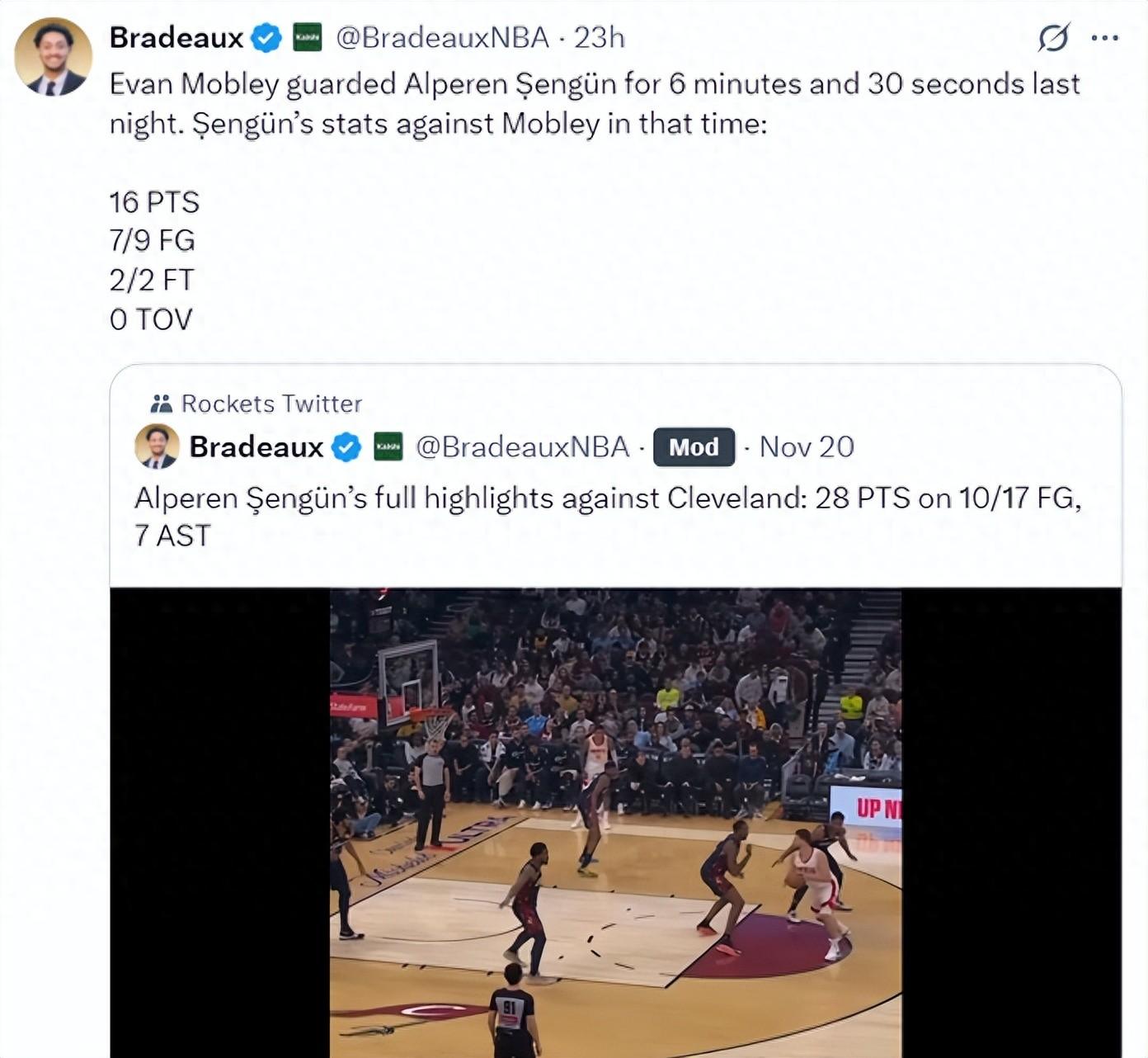 火箭記者Bradeaux寫道:2021屆最好的兩位球員,活塞坎寧安,火箭申京!