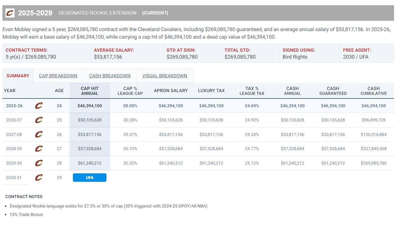 莫布利是去年夏天與騎士達成五年2.24億的頂薪合同,隨着他入選全明星、最佳防守一陣、最佳防守球員,莫布利的合同上浮到五年2.69億,他本賽季的薪水高達4639萬,而申京僅3394萬差距接近1300萬。