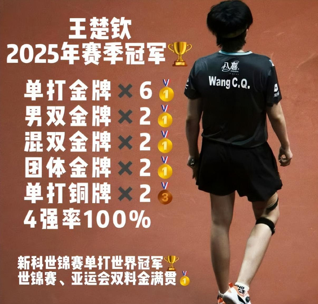 2025賽季王楚欽已經拿到了6個男單冠軍,男雙2個冠軍,混雙兩個冠軍,團體賽兩個冠軍,單打銅牌2個,這個賽季王楚欽從低谷到崛起還是付出了很多努力。