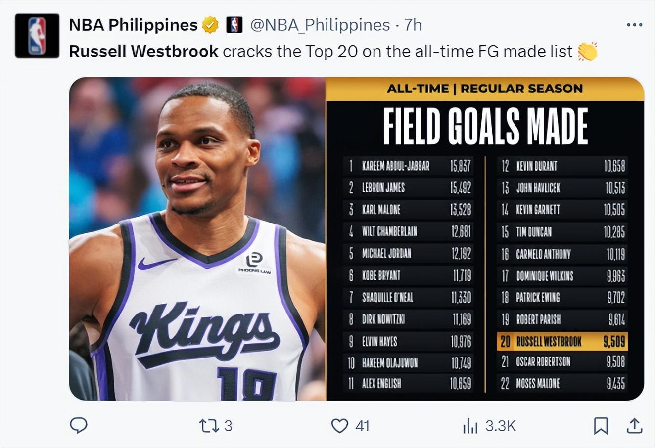此役又是威少的里程碑之夜,他完成生涯9509個運動戰進入聯盟歷史前20。