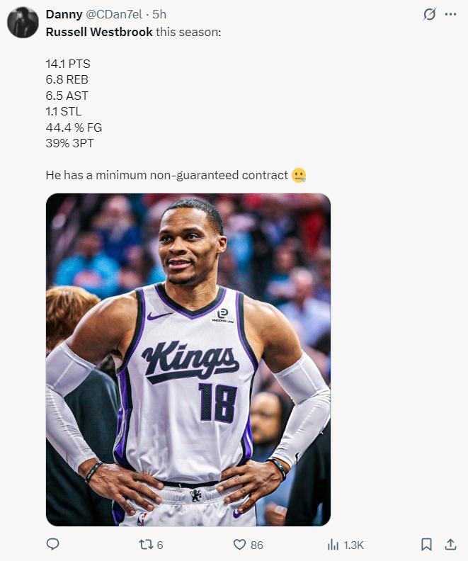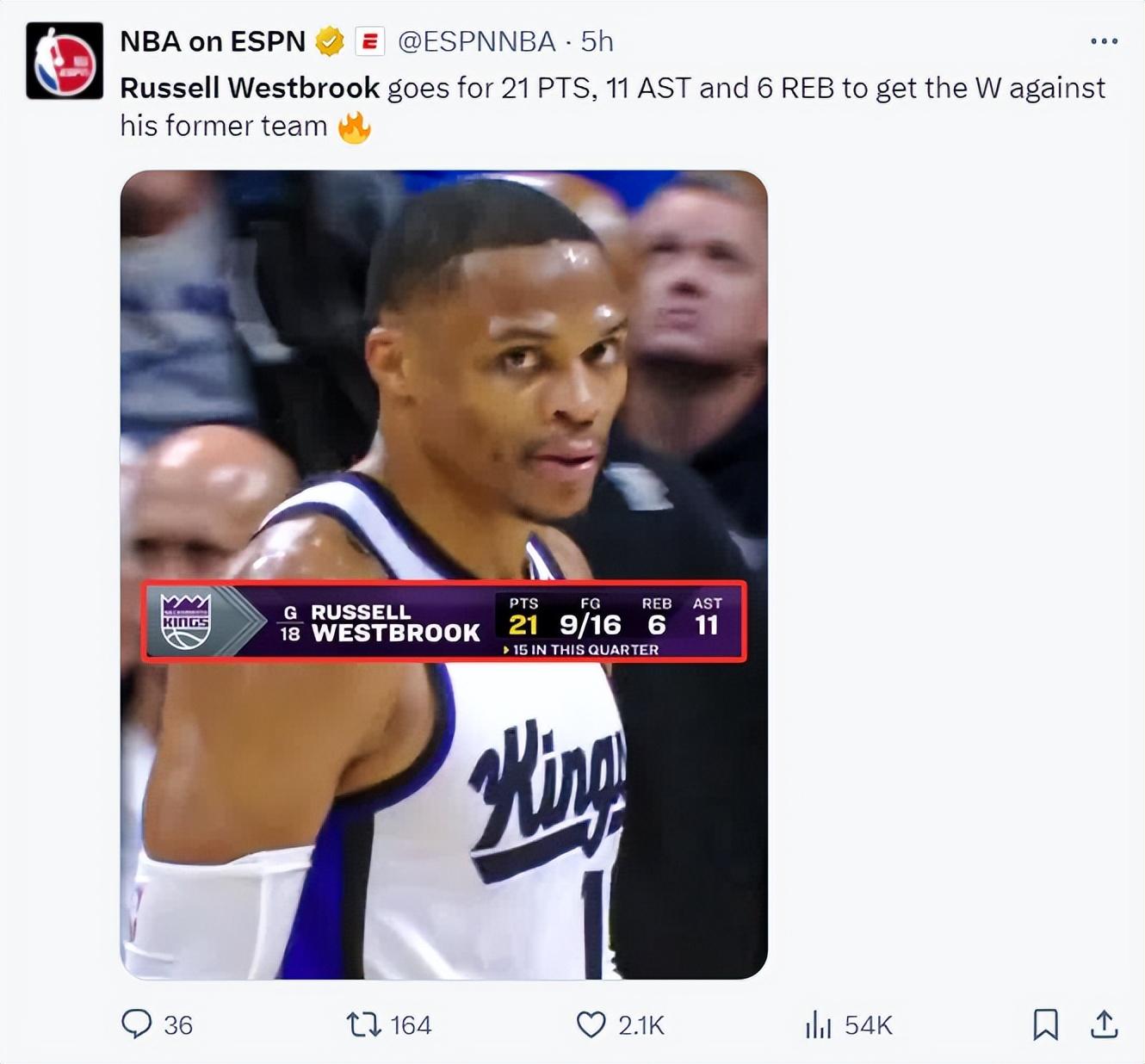 國王128-123險勝掘金拿到了本賽季第四場勝利,國王正值風雨飄搖之際能擊敗西部第二的掘金絕對是振奮人心的勝利,而拿下這場勝利的英雄是37歲的拉塞爾-威斯布魯克。休賽期無人問津的威少如今卻成爲國王唯一的亮點。
