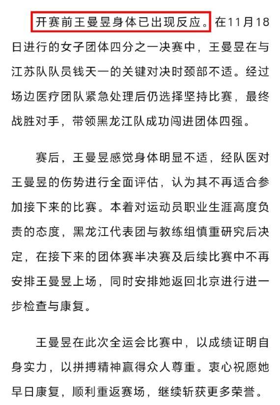 王曼昱不斷拉伸後決定繼續出戰,最終她3-0橫掃錢天一幫助黑龍江隊晉級四強,但賽後黑龍江官方宣佈因爲王曼昱的頸部不適,不再適合繼續出戰接下來的團體比賽,王曼昱會先返京治療。