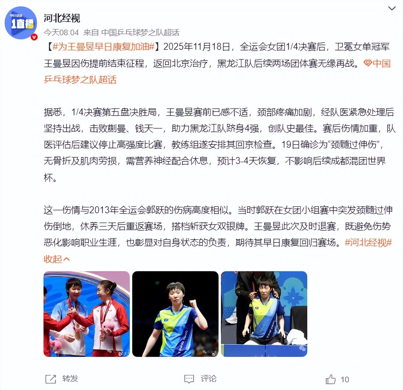 王曼昱這個傷情很像2013年全英郡年華郭躍的傷情,當時郭躍女團小組賽突發頸髓過伸倒地,休養三天後重返賽場。王曼昱在全運會退賽是避免傷勢惡化影響職業生涯。