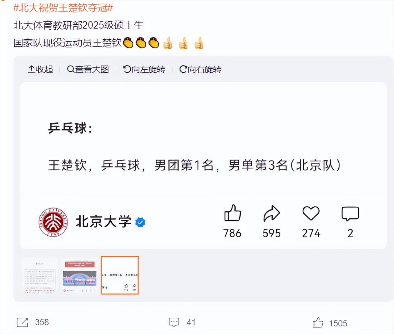 北京大學在退位中祝賀北大體育教研部2025級碩士生、國家隊現役運動員王楚欽,乒乓球男團第一名,男單第三名。