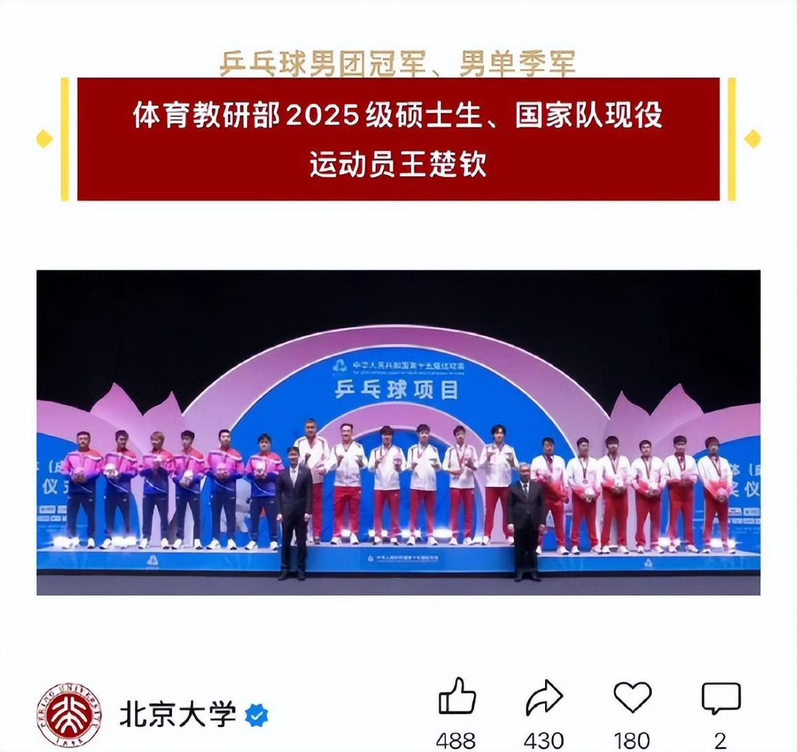 王楚欽今年剛剛進入北京大學深造,他是2025級體育教研部的新生,王楚欽這個排面直接拉滿了。