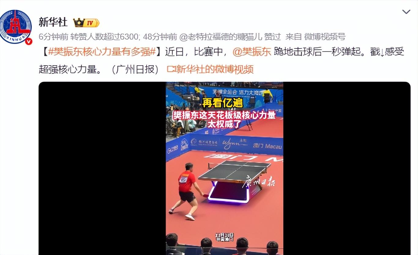 新華社:近日,比賽中,樊振東跪地擊球后一秒彈起,感受超強的核心力量。這個核心力量簡直反人類,這就是爲什麼樊振東在今年的全運會上10戰10勝的關鍵。