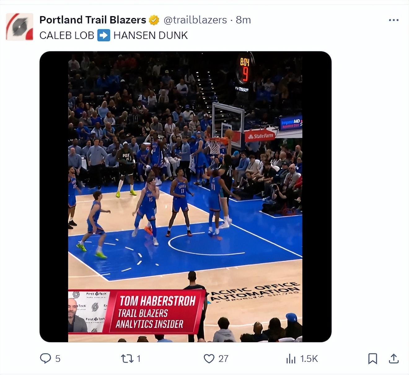 末節楊瀚森還完成了一個空中接力的暴扣,開拓者官方也曬視頻爲楊瀚森喝彩。