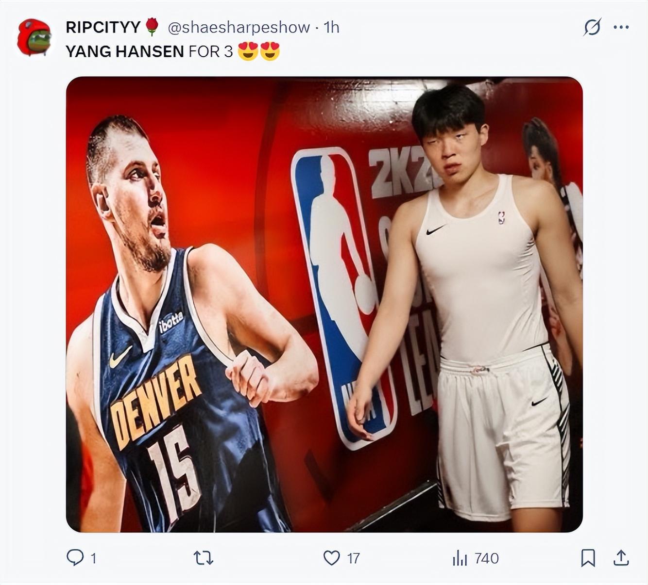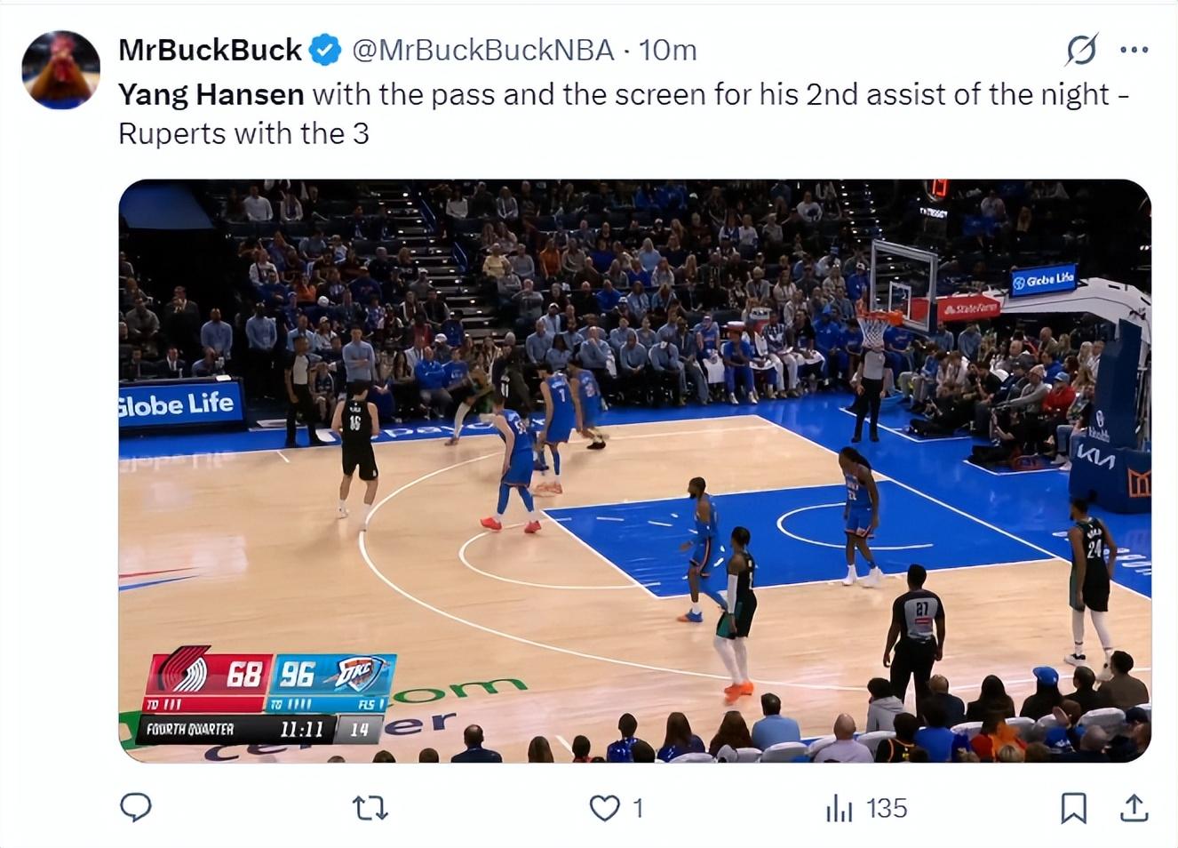 開拓者媒體還曬出了楊瀚森類似約基奇的一幕,楊瀚森拿球在三分線外指揮隊友跑位,手遞手後隊友命中三分球,楊瀚森擋住了追防的對手。