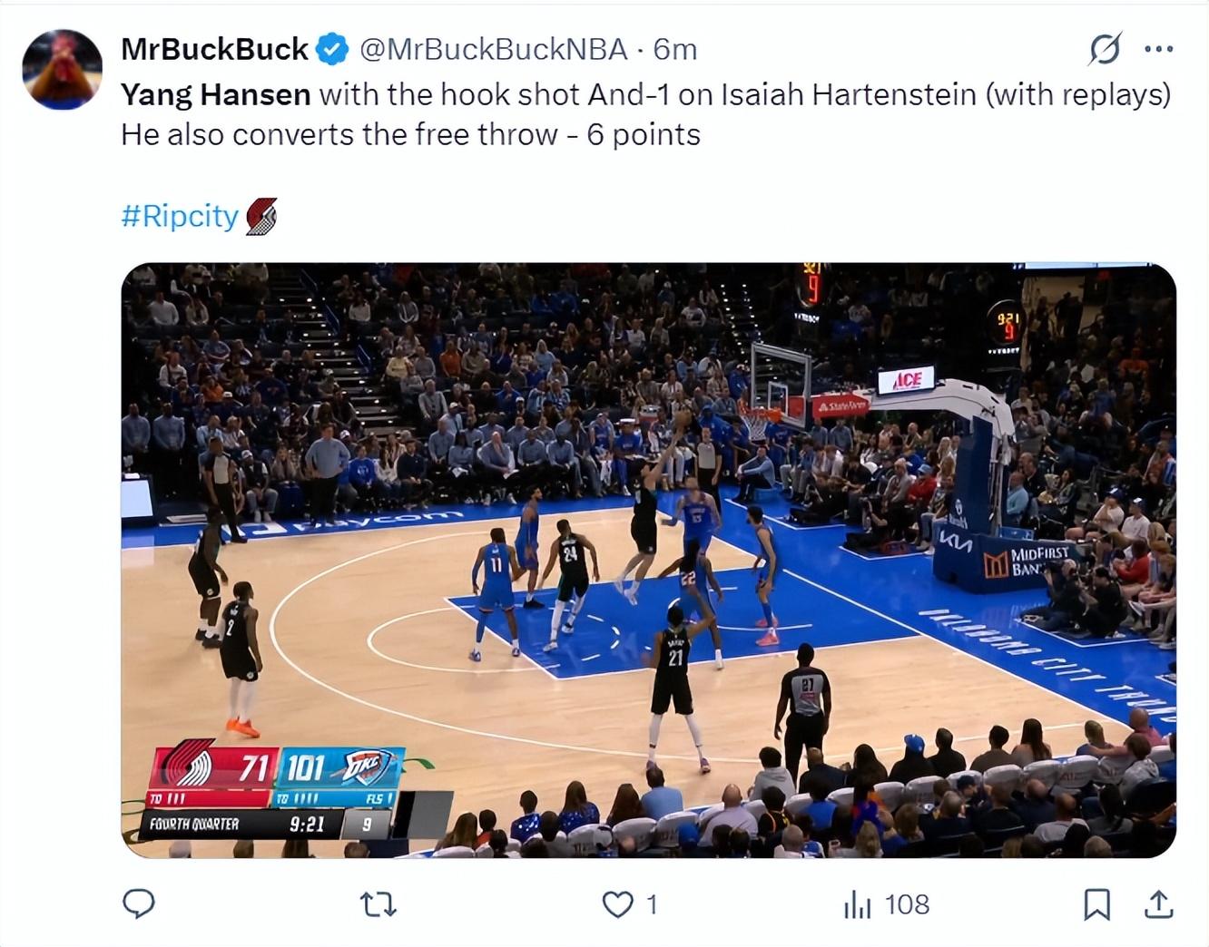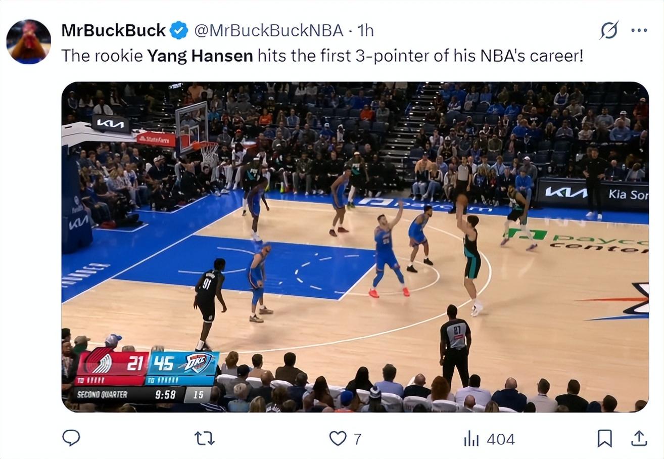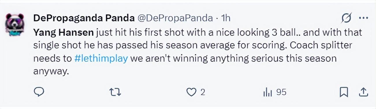 拓媒:楊瀚森命中了生涯第一個三分球,他本場比賽得分已經超過了賽季平均,斯普利特教練應該給他登場時間,因爲開拓者這個賽季很難有突破性的成績可言。