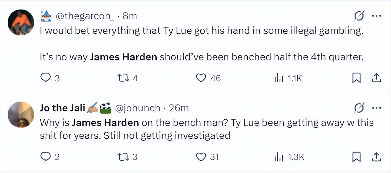 1.我敢拿一切打賭,泰倫-盧肯定參與了某些非法賭博。詹姆斯-哈登在第四節只打很少時間,這根本說不通;