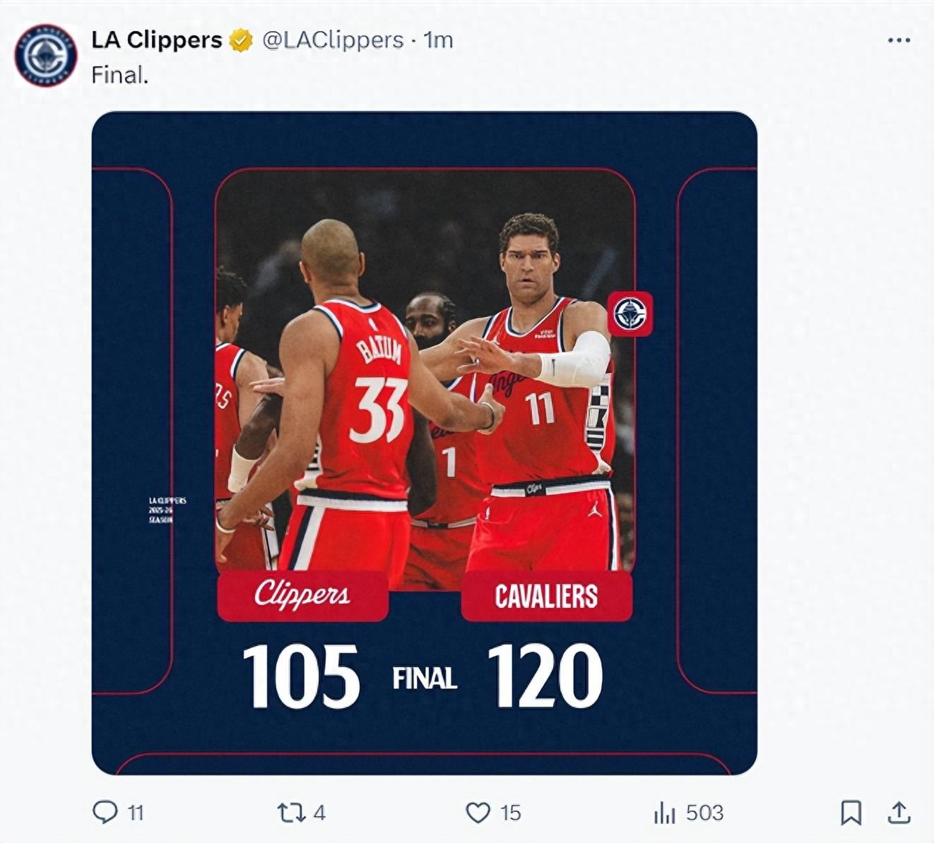 快船105-120慘敗騎士,最近的12場比賽輸掉了其中的10場,這場比賽快船隻頂住了上半場,上半場打完快船隻落後7分,但第三節打完後分差已經來到13分,末節泰倫盧一直將哈登按在板凳上,用老保羅打一號位,最終快船繼續被拉開分差。