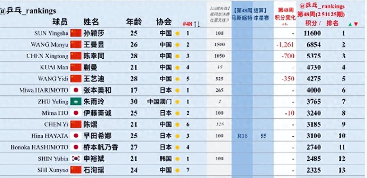 因爲法蘭克福站、馬斯喀特站、蒙彼利埃站王曼昱都沒有參與,本週后王曼昱已經扣掉1261分,目前世界排名積分6854分還是排在第二名的,孫穎莎仍是積分破萬的世界第一。