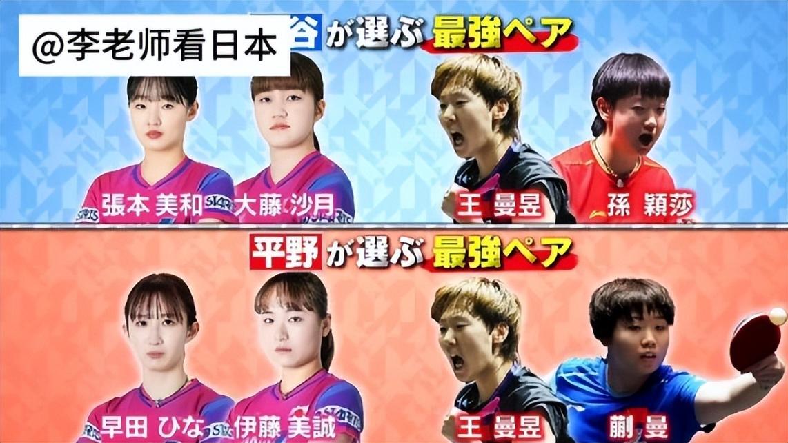 雙打:張本美和/大藤沙月VS王曼昱/孫穎莎、早田希娜/伊藤美誠VS王曼昱/蒯曼,不管日本隊派出任何模式的對陣,他們覺得日本隊都沒有勝算,因爲自2019年12月王曼昱輸給伊藤美誠後,她已經有6年出戰日乒不敗。