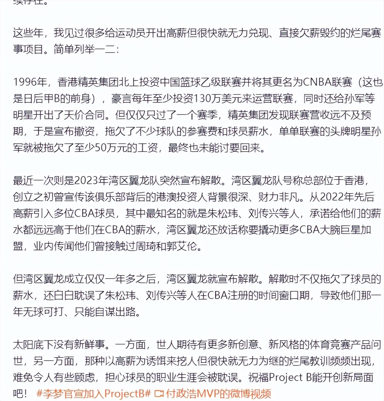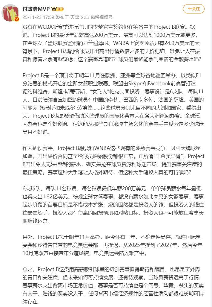 付政浩認爲,Project B聯賽有可能是那種打着高薪爲誘餌來挖人最終爛尾的聯賽,因爲女籃項目一直以來招商都非常困難。