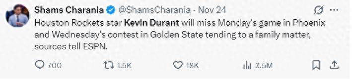 11月24日晚,ESPN記者Shams透露,火箭球星凱文-杜蘭特因爲個人原因將缺席對陣太陽、勇士兩場比賽。