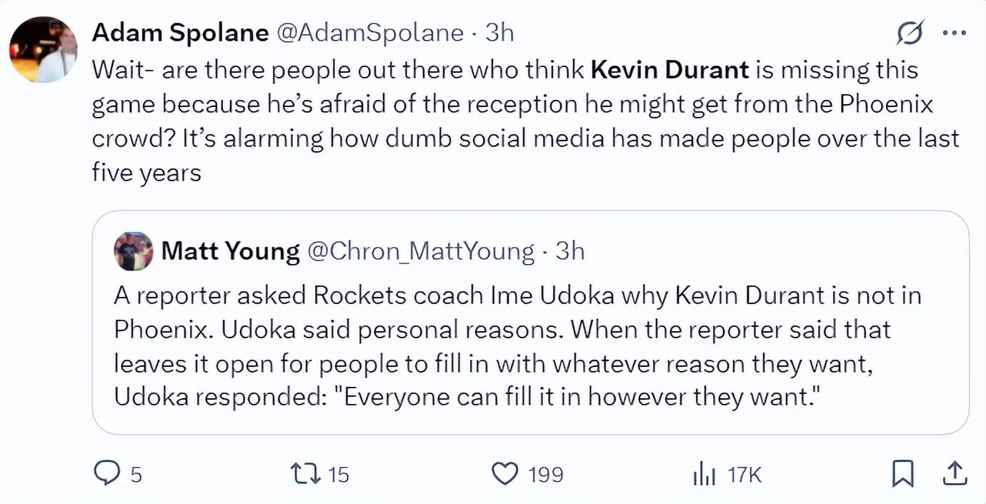 火箭記者Adam Spolane則寫道:難道真的有人認爲杜蘭特缺席VS太陽是因爲他害怕菲尼克斯球迷的冷眼嗎?過去五年裏,社媒的言論讓人變得愚昧不堪。