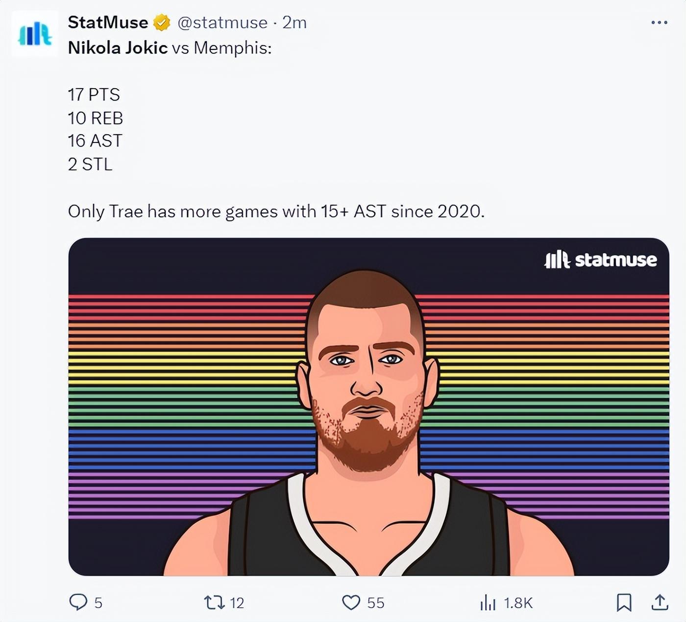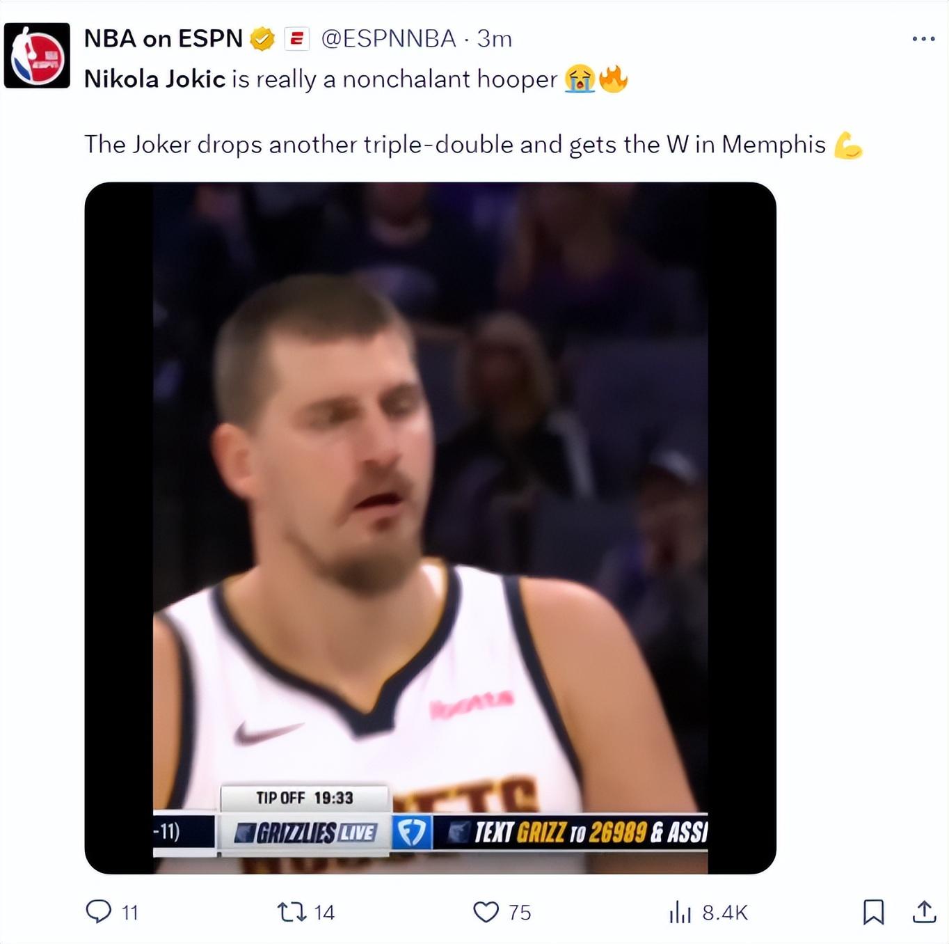 NBA on ESPN官方寫道:約基奇漫不經心的拿到三雙數據,他帶領掘金擊敗了灰熊。
