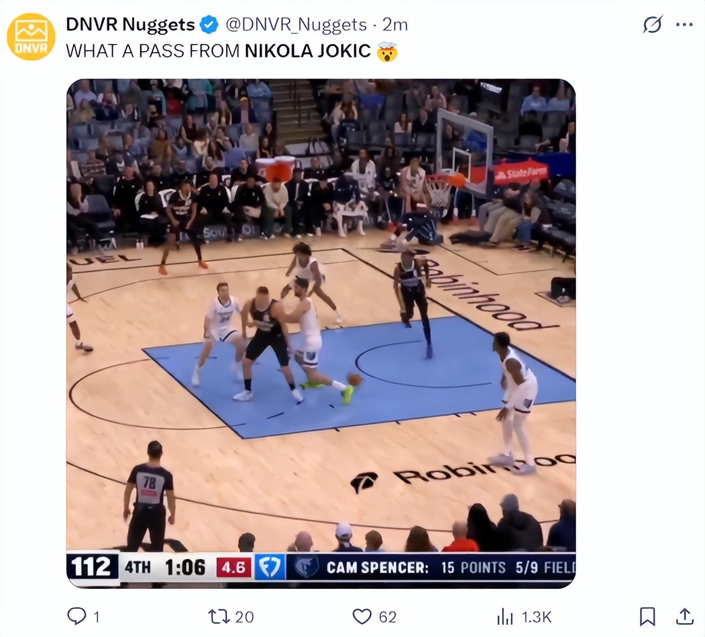 這場比賽約基奇的妙傳令人歎爲觀止,尤其是這個面對雙人包夾的轉身no look pass,還是一個擊地傳球,實在是太精彩了。