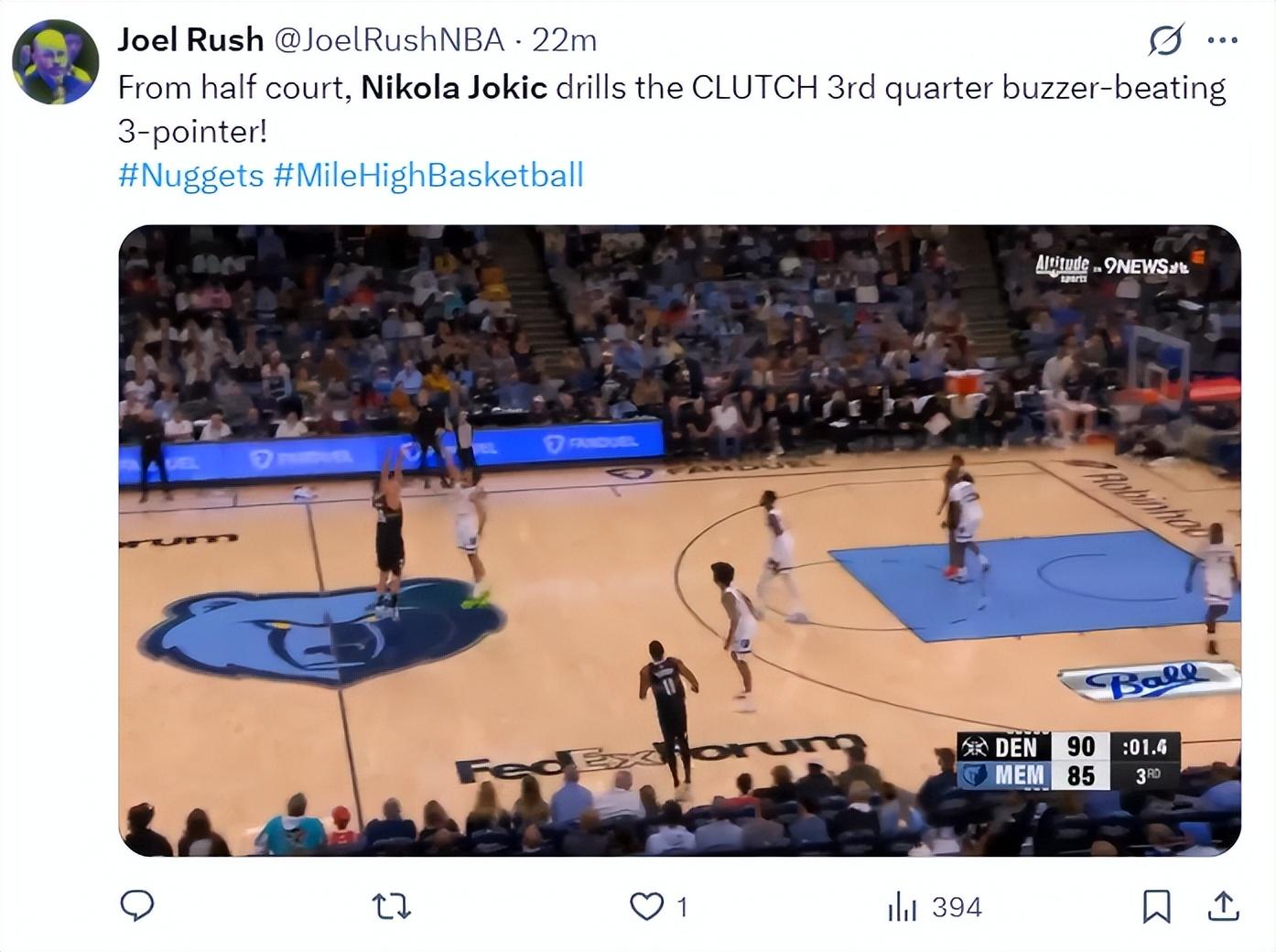 第三節結束前約基奇還命中了一個logo 三分球,這個三分球是真的踩着logo的中間位置命中,約老師這個投射能力還是值得小薩、申京學很長時間。