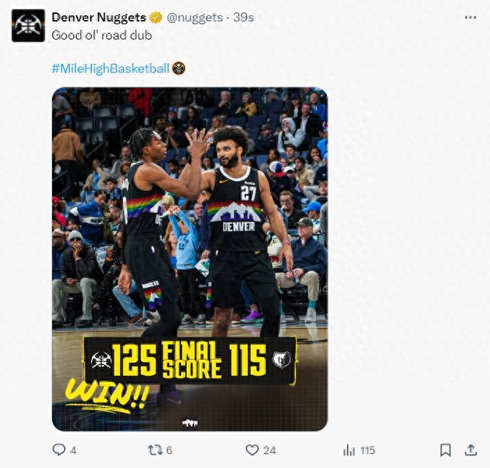 北京時間11月25日,掘金125-115大勝灰熊避免連敗,這場比賽後掘金拿到13勝4負的戰績重返西部第二,湖人隊12勝4負下滑到西部第三。此役灰熊的核心莫蘭特繼續高掛免戰牌,掘金在約基奇的帶領下一直手握微弱領先,末節灰熊的反撲氣焰也被約基奇澆滅。
