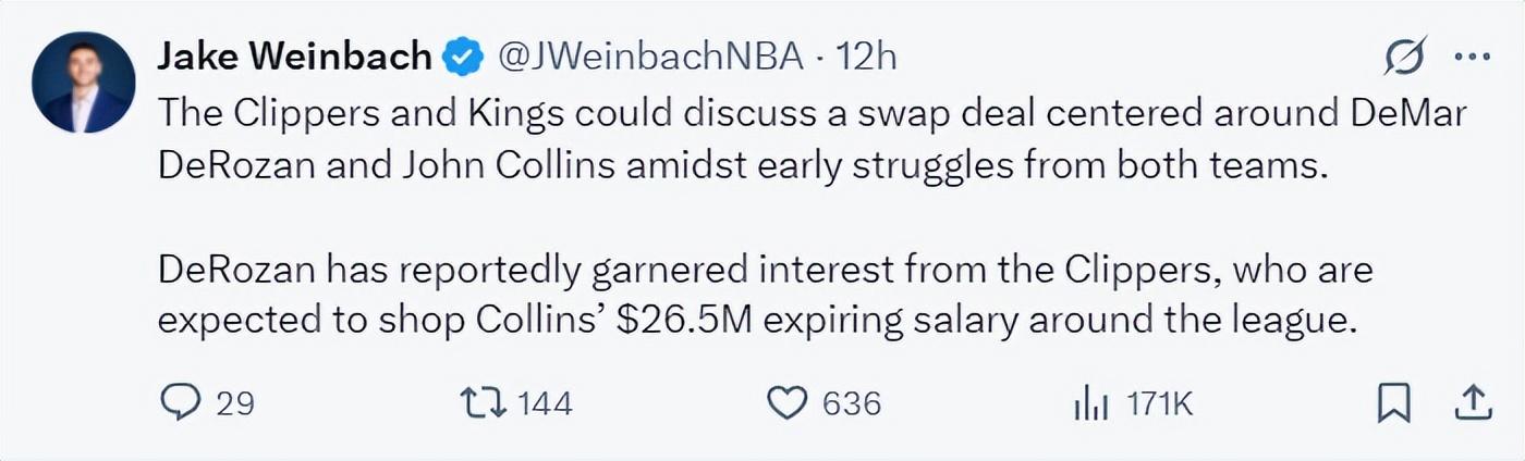 根據NBA記者Jake Winbach的報道,快船與國王可能會圍繞德羅贊。科林斯展開交易談判,兩支球隊在賽季初的表現都很掙扎,科林斯2650萬的到期合同對於國王來說也是一個不錯的資產。
