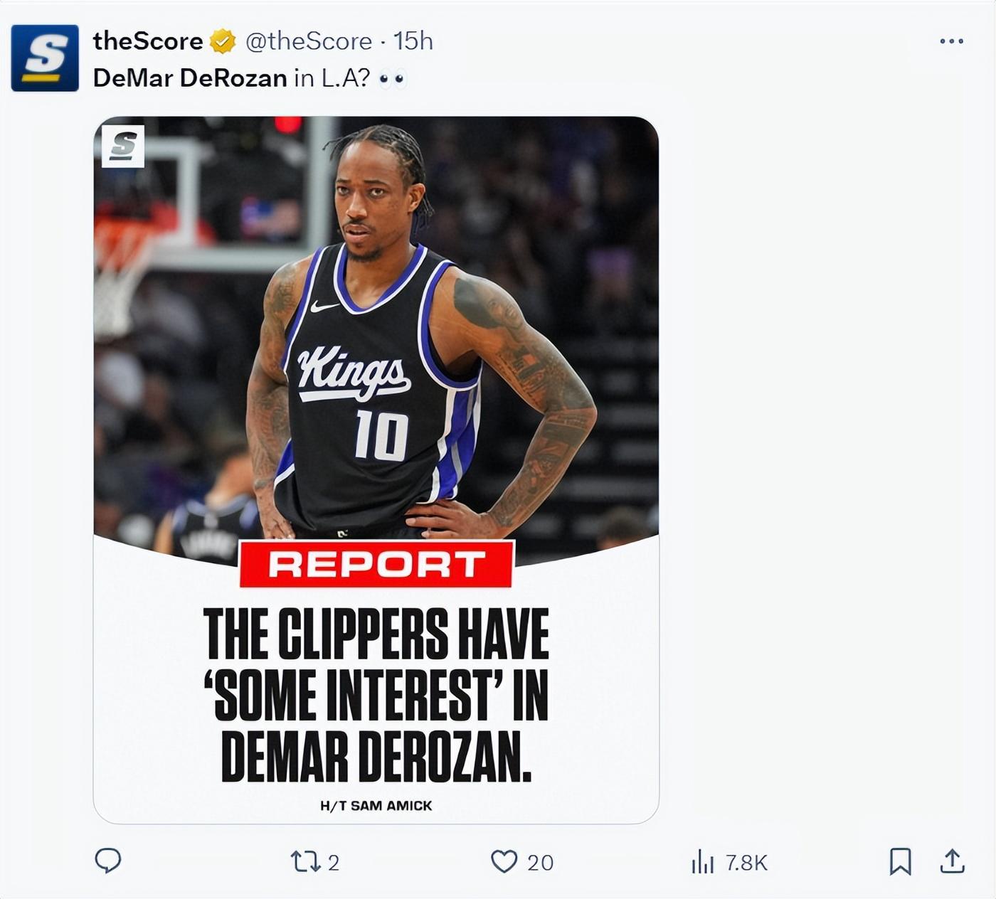 賽前TA記者薩姆-阿米克就報道,洛杉磯快船有意德羅贊,因爲國王已經將德羅贊、拉文、小薩、蒙克等人擺上貨架,甚至有傳言說國王可能會裁掉德羅贊。