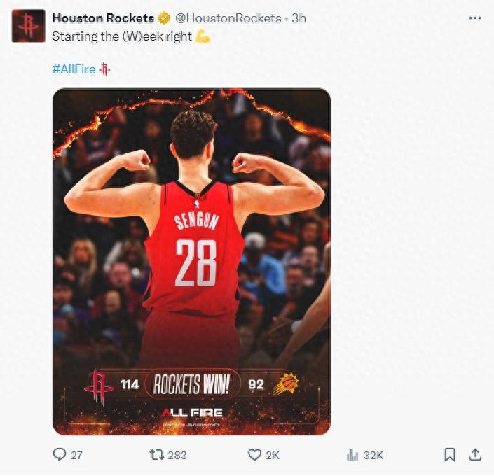 火箭114-92大勝太陽,這場比賽是火箭、太陽休賽期大交易後的第一次交手,只可惜杜蘭特、杰倫-格林兩位交易核心都缺席,好在阿門、申京、狄龍、小賈等人爲球迷們聯手貢獻了一場精彩的比拼,狄龍拿到28分,阿門拿到28+8+7。