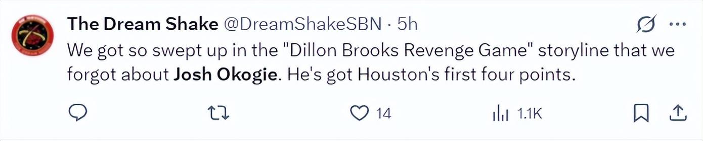 賽後太陽媒體寫道:我們完全沉浸在狄龍的復仇計劃情節中,卻忘記了奧科吉的存在,他爲火箭拿到開場的4分。