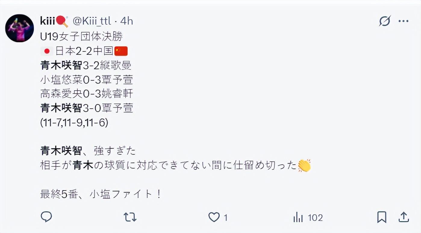 2025年國際乒聯世青賽,U19女團決賽,中國隊3-2逆轉日本隊奪冠,這場比賽縱歌曼決勝盤0-2落後3-2逆轉小鹽悠菜成爲國乒的超級功臣,日乒這邊小鹽悠菜、高森愛央都沒有取分,18歲的青木咲智一人獨取兩分。