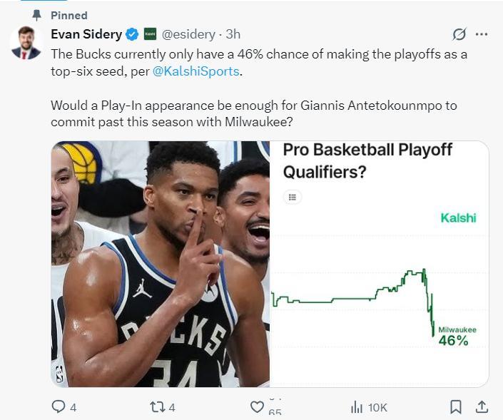 北京時間11月26日凌晨,埃文-斯迪瑞再度發文,根據KalshiSports 的數據。目前排名東部第九的雄鹿進入東部前六的概率只有46%(不打附加賽)。如果揚尼斯在季後賽中再登場一次這是否足以讓他決定留守密爾沃基呢?