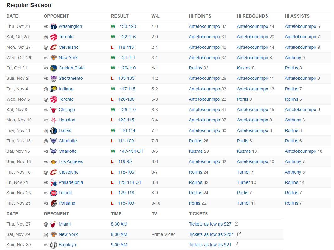 字母哥缺席後雄鹿是一波三連敗,本賽季字母哥缺席的五場是1勝4負(只擊敗了勇士),這一波五連敗分別不敵:湖人、騎士、費城、活塞、開拓者,沒有揚尼斯的雄鹿的確太次。