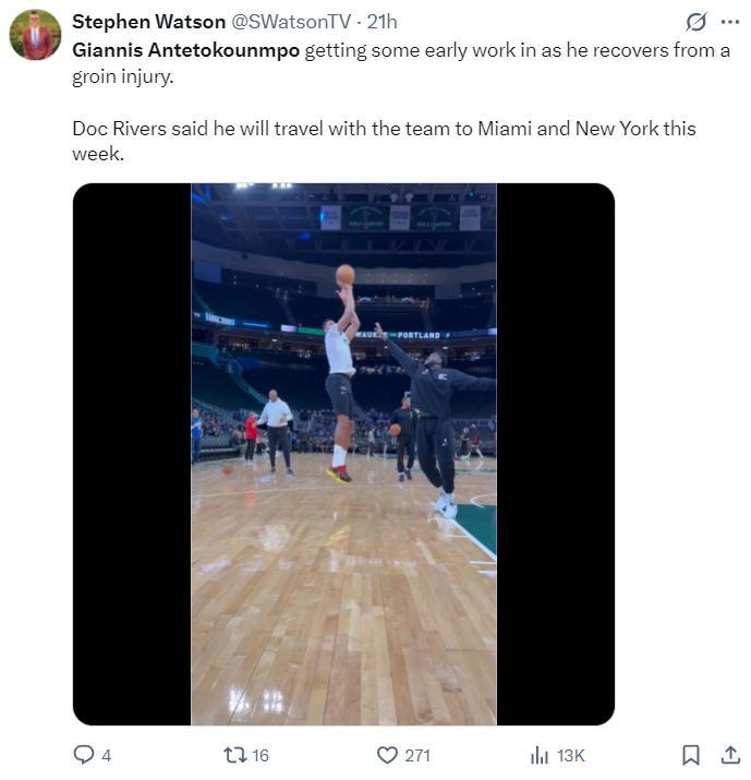 根據道格-裏夫斯的說法,揚尼斯在腹股溝受傷的初期就已經開始恢復日常訓練,接下來雄鹿的客場之旅(熱火、尼克斯)字母哥也會隨隊,根據Shams的報道揚尼斯是腹股溝一級拉傷,恢復時間是1-2周。