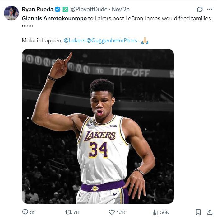 湖人記者Ryan Rueda已經開始暢想揚尼斯未來離隊的情況,他寫道:揚尼斯加盟湖人隊後可以完美取代勒布朗-詹姆斯的位置,將幫助這支球隊度過很多難關,夥計們讓這一切實現吧。