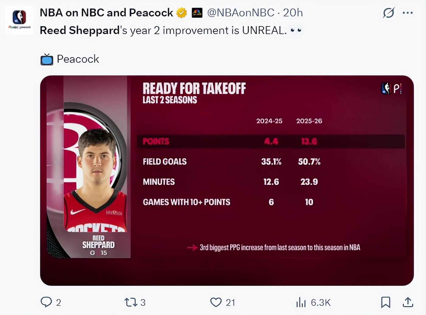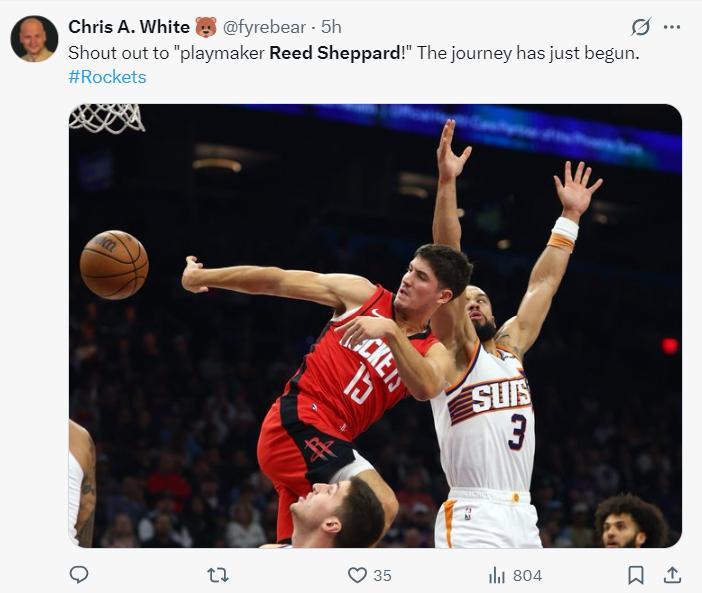 火箭記者克里斯-懷特曬出謝潑德一張妙傳的圖寫道:向火箭的組織核心謝潑德致敬。這說明謝潑德的傳球能力也在獲得外界認可。