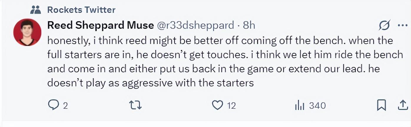 緊接着美媒寫道:老實說我認爲謝潑德更適合打替補,當他是先發時他沒有太多機會與球權。我們應該讓他在替補席上,然後關鍵時刻登場,要麼幫助球隊重新取得領先,要麼幫助我們重新獲得領先,與主力們一起登場,他的進攻積極性明顯不高。