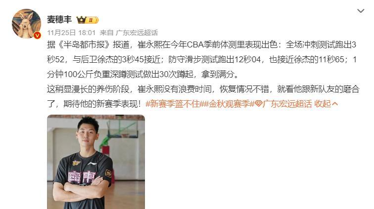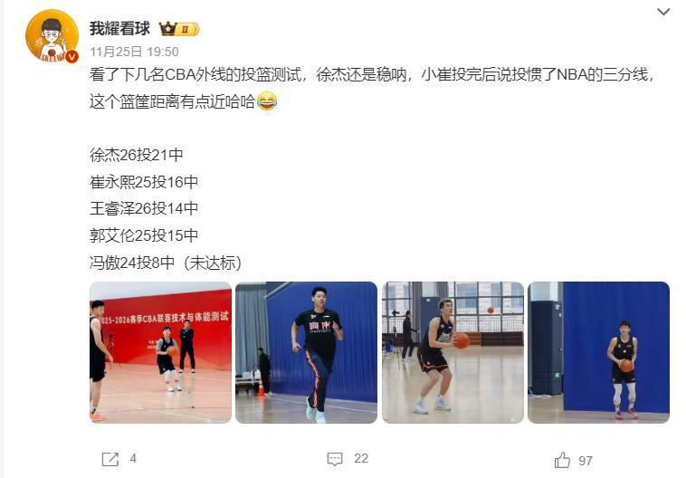 從目前爆料的一些數據能看出崔永熙的恢復狀態非常好,CBA外線投籃測試,崔永熙25中16,比王睿澤還出色,徐傑26中21,郭艾倫是25中15。