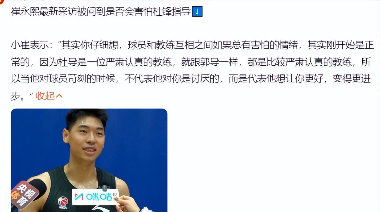 崔永熙也談到了杜鋒、楊瀚森等人的話題,但他最多的還是談自己身體情況,他表示自己會努力康復爭取趕上CBA新賽季的第一場比賽,他還表示一開始害怕杜鋒指導屬於正常情況。