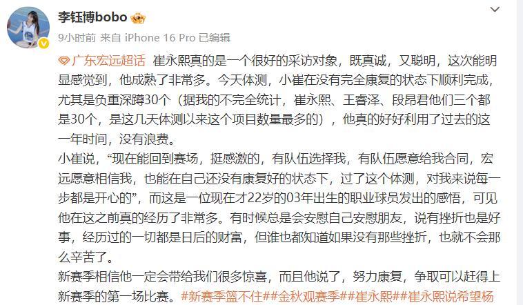 她寫道:小崔在沒有完全康復的情況下順利完成體測,這一年他真的沒有浪費,這位22歲的球員發出最真摯的感悟,可見他之前真的經歷非常多。